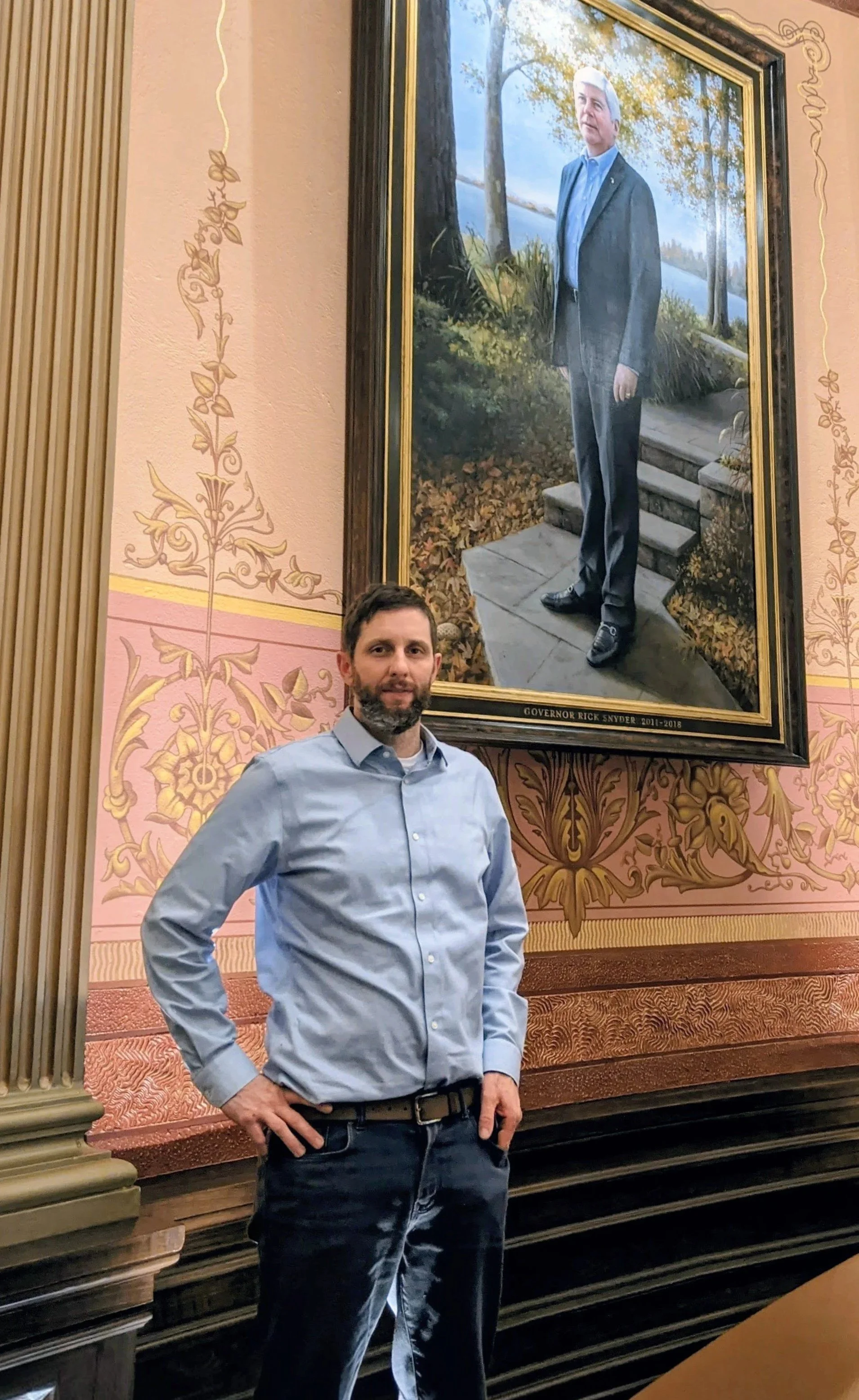 Risner with Governor Rick Snyder portrait at Michigan State Capitol, 2019.